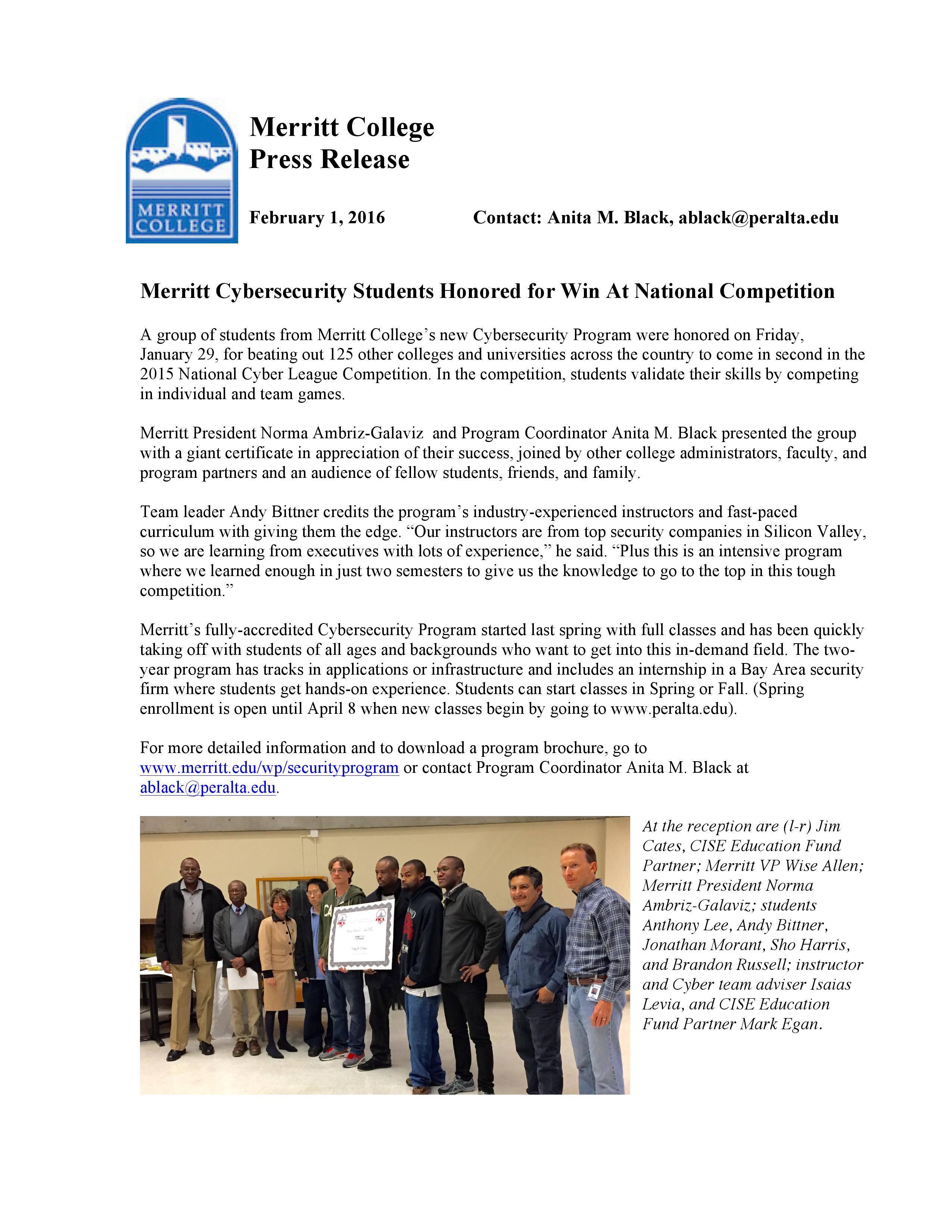 In the Gold division, our team, Merrittocracy, placed 5th overall out of 738 teams which is the second time in our existence that we placed within the top five nationally at the highest level! In other categories, our student team, TWVycml0dCBCb3ROZXQgVHJvamFucw== (which translates from Base 64 to ASCII at the ‘Merritt BotNet Trojans’) placed 1st in the Silver division out of 278 teams – a repeat of last year’s NCL competition! GO, TEAM!