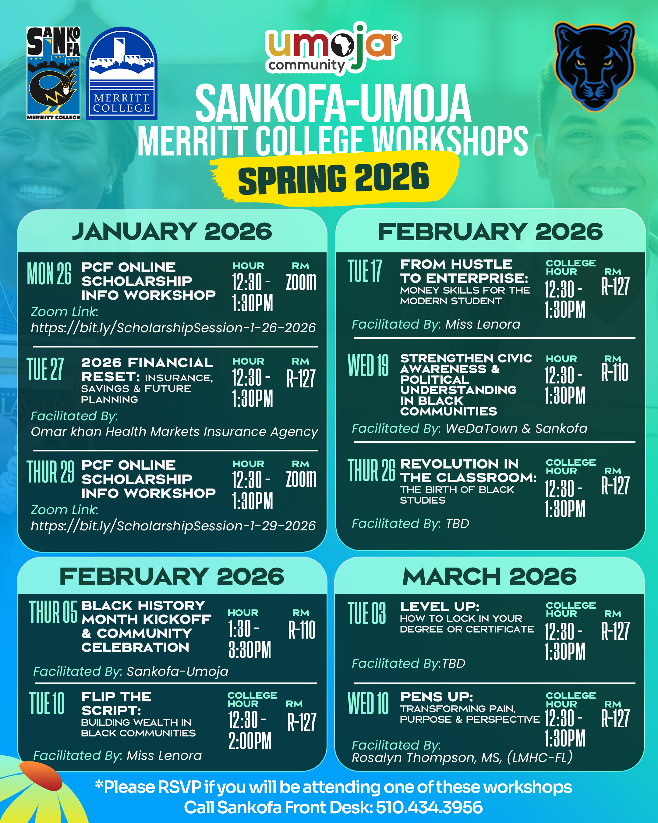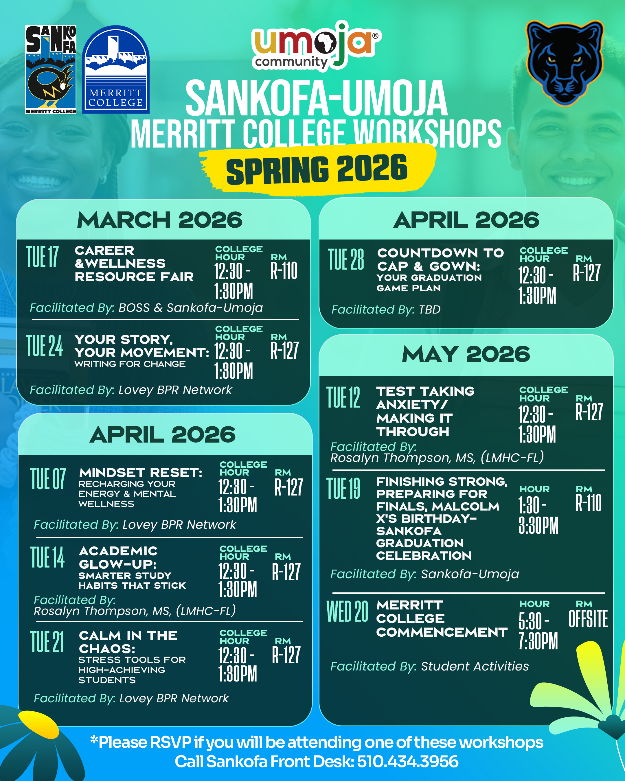The program emphasizes the successful completion of English, mathematics, science, and information technology courses, while also supporting students in exploring STEM disciplines and other academic pathways as they prepare for their careers. Sankofa–Umoja assists students with the development of Student Educational Plans (SEPs), course selection, addressing personal concerns, and connecting to support services across the Merritt College campus.